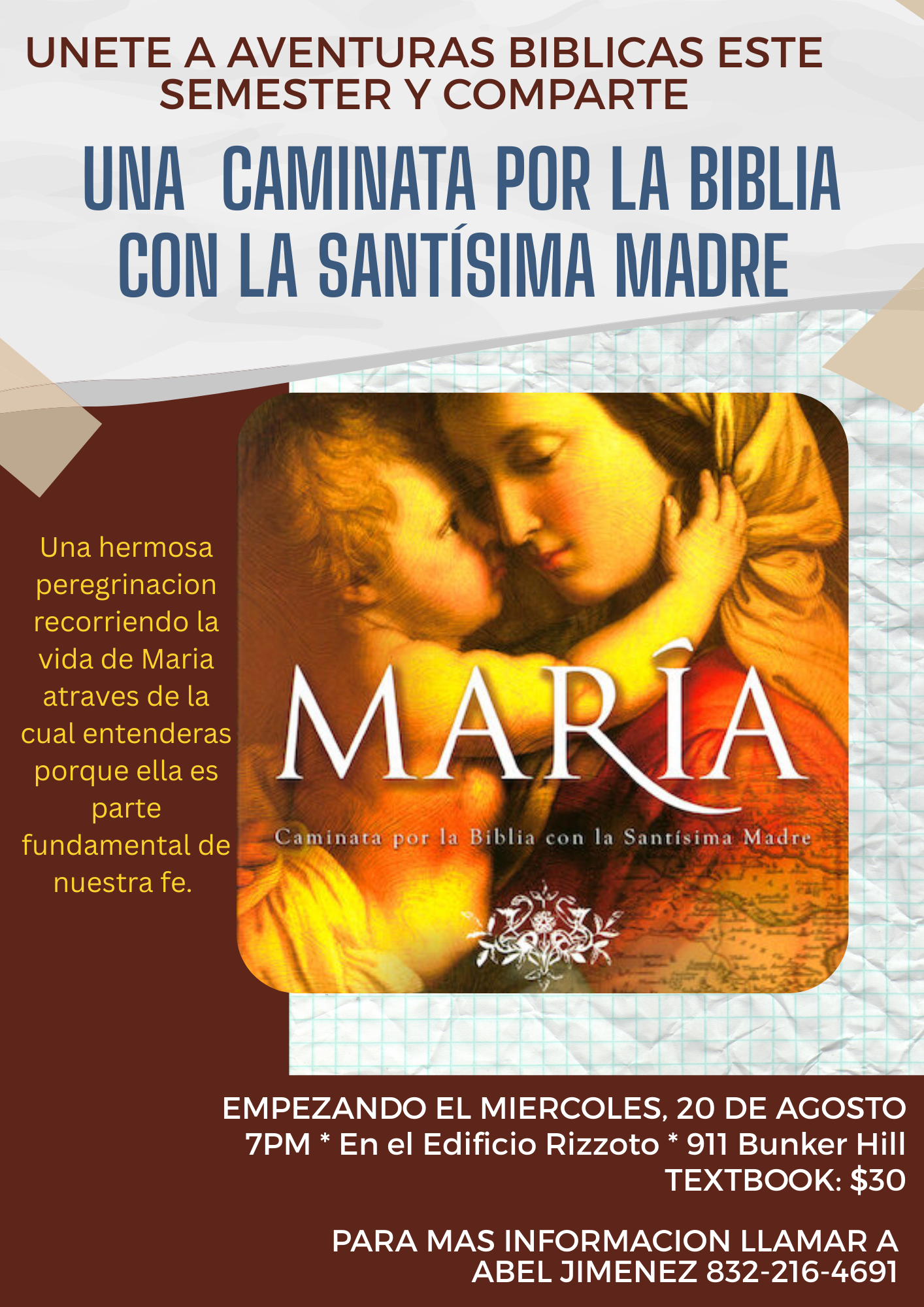 Aventura Biblica se reune los Miercoles de las 7 a las 9:30 pm. Edificio Rizzotto: 911 Bunker Hill Rd. 77024 PARA MAS INFORMACION EN ESPAñOL: Abel Jimenez (832-216-4691 or jimeneza76@yahoo.com) Para Mas Informacion